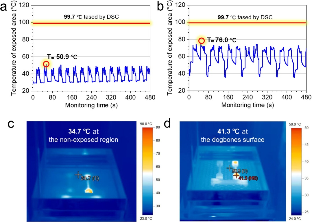 通过近红外成像仪监测了拉伸杆打印过程中的温度变化情况,如图3(a,b)所示;打印支撑结构与产物结构时,曝光区域所能达到的最高温度分别为50.9 ℃与76.0 ℃,均低于打印配方的起始热分解温度99.7 ℃;且打印结束后,未曝光区液面的温度为34.7 ℃,拉伸杆表面的温度为41.3 ℃,这些温度表明打印过程是热稳定的。